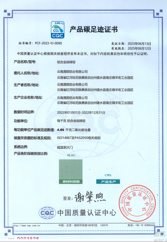 2023年6月13日完成換證工作,涌順扁錠碳足跡數(shù)值低至 4.86KgCO2/噸鋁。